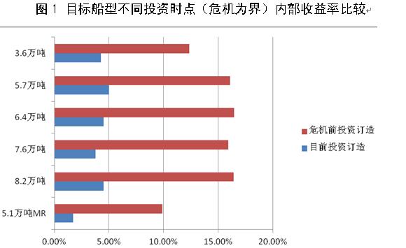 就中遠(yuǎn)期的三大主流船型市場(chǎng)而言,我們一方面要看未來特定市場(chǎng)運(yùn)力供求關(guān)系;另一方面,更要看當(dāng)期投資成本大小和由此帶來的船隊(duì)競(jìng)爭(zhēng)力問題。上述分析已經(jīng)表明,未來較長(zhǎng)時(shí)期內(nèi)全球各型船舶的船隊(duì)均存在運(yùn)力過剩壓力,航運(yùn)費(fèi)率可能會(huì)長(zhǎng)期在低位徘徊,但是,如果航運(yùn)企業(yè)以當(dāng)前價(jià)格投資造船,仍能以較低的投資成本確保相對(duì)較高的投資回報(bào)率。理由是,一方面,以當(dāng)前成本訂造的新船肯定有很高的市場(chǎng)競(jìng)爭(zhēng)力;另一方面,在某種程度上也會(huì)拉低前幾年高峰期訂造的高價(jià)船的單位平均投資成本,提升船隊(duì)綜合市場(chǎng)競(jìng)爭(zhēng)力。以目標(biāo)船型不同投資時(shí)點(diǎn)(以危機(jī)爆發(fā)前后為界)內(nèi)部收益率測(cè)算比較為例,我們發(fā)現(xiàn),國際金融危機(jī)爆發(fā)后訂造的目標(biāo)船型內(nèi)部收益率均能達(dá)到15%左右的較高水平,而危機(jī)前訂造的目標(biāo)船型內(nèi)部收益率均不足5%。由此可見,當(dāng)前投資優(yōu)勢(shì)十分顯著。