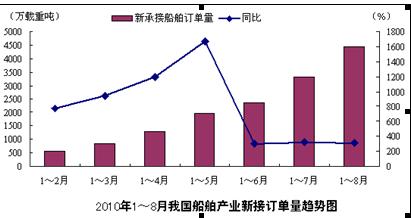 2010年1~8月,我國新承接船舶訂單4451萬載重噸,是去年同期新接訂單量的4.1倍,其中海船為1275萬修正總噸,出口船舶占總量的75.3%。