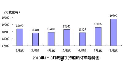 截至8月底,手持船舶訂單量19399萬載重噸,比2009年底手持訂單上升3.1%,其中海船為5395萬修正總噸,出口船舶占總量的87.3%。