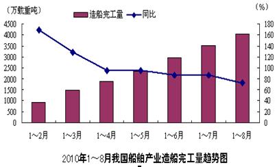 2010年1~8月,全國造船完工量4037萬載重噸,同比增長72.7%,其中海船為1210萬修正總噸,出口船舶占總量的81.9%。