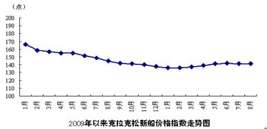 此外,當(dāng)前船價總體水平仍很低,船企新訂單的贏利情況并不樂觀。8月克拉克松船價綜合指數(shù)為141點,延續(xù)了前幾個月的弱勢。船舶市場已明顯是買方市場,船企議價能力趨弱,船價持續(xù)上揚的難度很大。