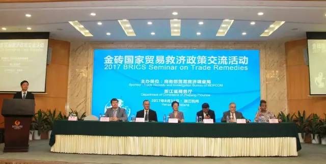 2017年8月31日上午“金磚國家貿(mào)易救濟(jì)政策交流活動會”在杭州浙江國際大酒店召開。商務(wù)部、商務(wù)廳、各地市商務(wù)局領(lǐng)導(dǎo)、律師專家及預(yù)警點(diǎn)的預(yù)警專員等120人出席了會議。浙江省分管商務(wù)工作的梁黎明副省長出席會議并作了熱情洋溢的致辭。商務(wù)部貿(mào)易救濟(jì)調(diào)查局王賀軍局長,介紹了全國“二反一保”的形勢,也肯定了浙江省在貿(mào)易救濟(jì)工作中作出的種種努力。尤其是出口預(yù)警示范點(diǎn)工作及“四體聯(lián)動”應(yīng)訴工作取得了好的成績。會議上半段,由省商務(wù)廳韓杰副廳長主持會議。舟山市出口船舶預(yù)警示范點(diǎn)、舟山市出口水產(chǎn) 警示范點(diǎn)預(yù)警專員參加了會議。