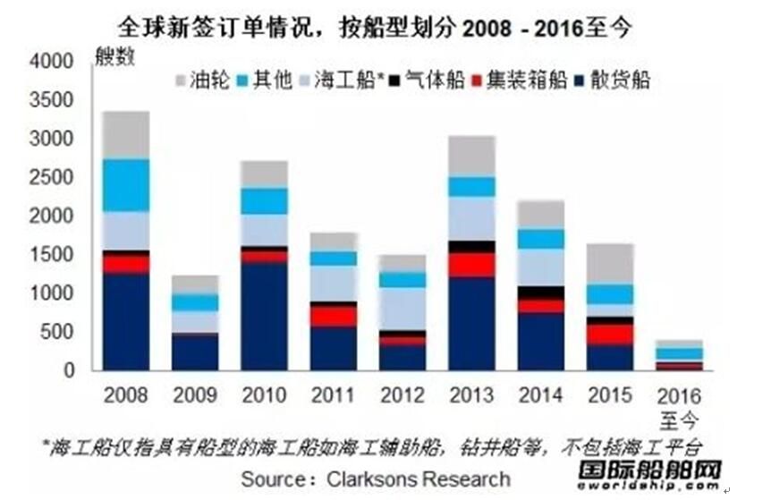 支撐散貨船訂單量的基本只有在中國船廠訂造的30艘Valemax型礦砂船。油輪新簽訂單僅成交117艘,同比下降76%,尤其是大型原油油輪訂單明顯減少。盡管有一些特殊油輪訂單如小型化學(xué)品船及瀝青船等,但其體量對總訂單量的貢獻仍然有限。集裝箱船訂單的情況與油輪類似,從數(shù)量來看同比下滑72%,市場對大型集裝箱船的興趣明顯減弱,3,300TEU以上的訂單僅成交5艘。與此同時,巴拿馬運河的拓寬、韓進海運的破產(chǎn)、集運聯(lián)盟的整合、兼并等,更是增加了集裝箱船市場的不確定性。今年的新簽訂單主要集中在一些特殊船型領(lǐng)域,如受船隊更新需求影響,歐洲船東訂立的一批客滾船訂單等。豪華郵輪訂單尤為顯眼,共計有32艘簽訂,已超過2014及2015年的總量,其訂單總價值占全球新簽訂單總額的約一半。