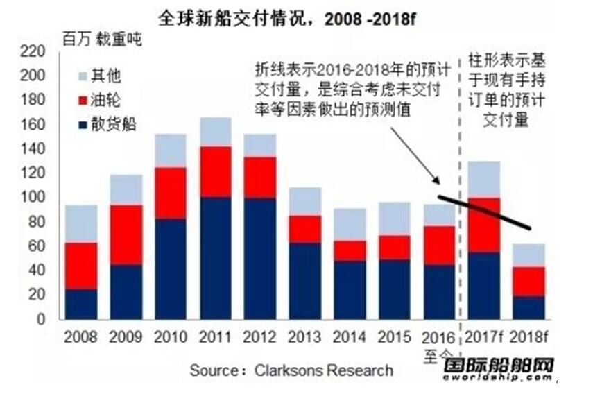 在新簽訂單量大幅減少和交付量穩(wěn)定的共同作用下,全球手持訂單量加速縮水:2016年12月初手持訂單量為3,713艘,2.3億載重噸,較年初相比縮減27%。按數(shù)量統(tǒng)計,散貨船仍占手持訂單的27%,油輪和集裝箱船則分別為23%和11%。如果以2015年的產(chǎn)能為基準粗略估計,當(dāng)前的手持訂單量僅能平均維持船廠未來2.4年的生產(chǎn)。(來源:克拉克森研究)