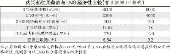 不同于歐洲內(nèi)河LNG動(dòng)力船的發(fā)展,中國最早在內(nèi)河船使用LNG作為動(dòng)力的嘗試來自商業(yè)嗅覺相對(duì)靈敏的民營能源企業(yè)。這些企業(yè)拿出資金對(duì)船東的內(nèi)河船進(jìn)行LNG動(dòng)力改造,又恰逢國家深入推進(jìn)節(jié)能減排,得到一定的政府補(bǔ)貼。當(dāng)柴油與LNG的價(jià)格差達(dá)到2500元/噸時(shí),使用LNG可為船東節(jié)約30%的燃料成本,按照當(dāng)時(shí)30萬~40萬元的改造成本,即便沒有政府補(bǔ)貼,3~4年也可通過燃料價(jià)格差收回改造成本,之后便可通過銷售LNG獲得利潤。但伴隨國家對(duì)LNG動(dòng)力船標(biāo)準(zhǔn)規(guī)范的提高,改造費(fèi)用增加到100萬元以上,同時(shí)柴油與LNG價(jià)格差越來越小,當(dāng)投資回收期超過8年,船東基本不會(huì)再考慮使用LNG做燃料(見表)。