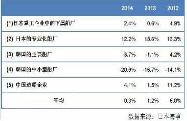 計(jì)算結(jié)果顯示2014年的平均營業(yè)收入利潤率為0.3%,比2013年下降了0.9個(gè)百分點(diǎn)。這主要是由于韓國船廠在海工項(xiàng)目上的失利導(dǎo)致了盈利能力急劇惡化,從而拉低了平均水平。與此相對照,專業(yè)化的日本船廠盡管也略有下滑,但卻仍然保持了高于10%的利潤率水平,最高的是日本的新來島船廠,利潤率高達(dá)18%。在全球造船業(yè)盈利總體水平幾乎接近于零的情況下顯得格外突出。