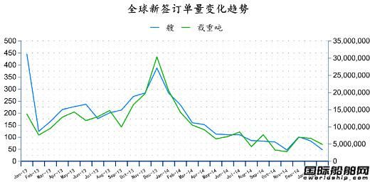 據(jù)克拉克松數(shù)據(jù)統(tǒng)計,2015年2月份全球船企新簽訂單48艘、共計4883485載重噸。與2015年1月份全球新簽訂單85艘、共計6711260載重噸相比較,數(shù)量環(huán)比下降37艘,噸位下降27.23%。與2014年2月份全球新簽訂單248艘、共計13651438噸相比較,艘數(shù)同比下降200艘,噸位同比下降64.23%。