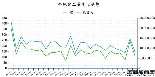 數(shù)據(jù)顯示,2015年2月份全球船廠共交付新船147艘,共計6002687載重噸。與2015年1月份全球新簽訂單262艘、共計13555954載重噸相比較,數(shù)量環(huán)比下降43.89%,噸位環(huán)比下降55.72%。與2014年2月份全球船廠共交付新船146艘,共計5996031載重噸相比較,數(shù)量上升1艘,噸位同比上升0.11%。