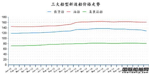 2月份散貨船、油船和集裝箱船新在造船價格指數(shù)為128點、161點和81點,油船環(huán)比下降4點,散貨船、集裝箱船持平上月。