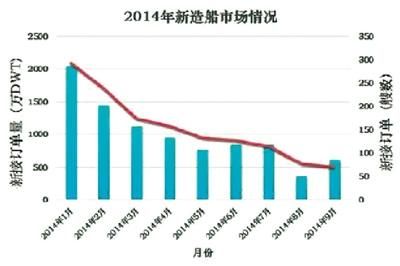 分季度來(lái)看,2013年四季度成交3548萬(wàn)載重噸,2014年前三季度分別成交2213萬(wàn)、1322萬(wàn)、864萬(wàn)載重噸,成一路下滑走勢(shì)。8月份更是慘淡,新接訂單量?jī)H為115萬(wàn)載重噸,9月份從載重噸來(lái)看,新接訂單量出現(xiàn)了大幅反彈,但成交艘數(shù)僅為35艘,比8月份的37艘還低。新接訂單載重噸數(shù)的反彈與9月份中遠(yuǎn)集團(tuán)在國(guó)內(nèi)船廠訂造多艘大型集裝箱船、大型散貨船有關(guān)。