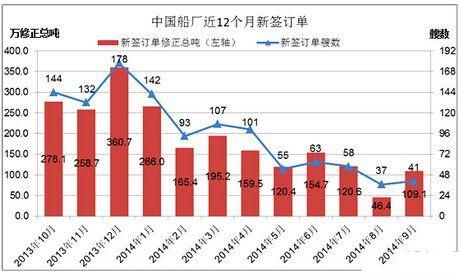據(jù)克拉克松統(tǒng)計(jì),2014年9月,中國(guó)船廠(chǎng)新接訂單為41艘, 109.1萬(wàn)CGT,環(huán)比上升了135.2%,同比下降了44.2%;近12個(gè)月,中國(guó)船廠(chǎng)的接單量呈先升后降的趨勢(shì),2013年10月至2013年12月,接單量呈上升趨勢(shì);2013年12月至2014年9月,接單量呈下降趨勢(shì);2014年1至9月,中國(guó)船廠(chǎng)接單量為1320.5萬(wàn)CGT,較2013年1至9月下降了16.9%。