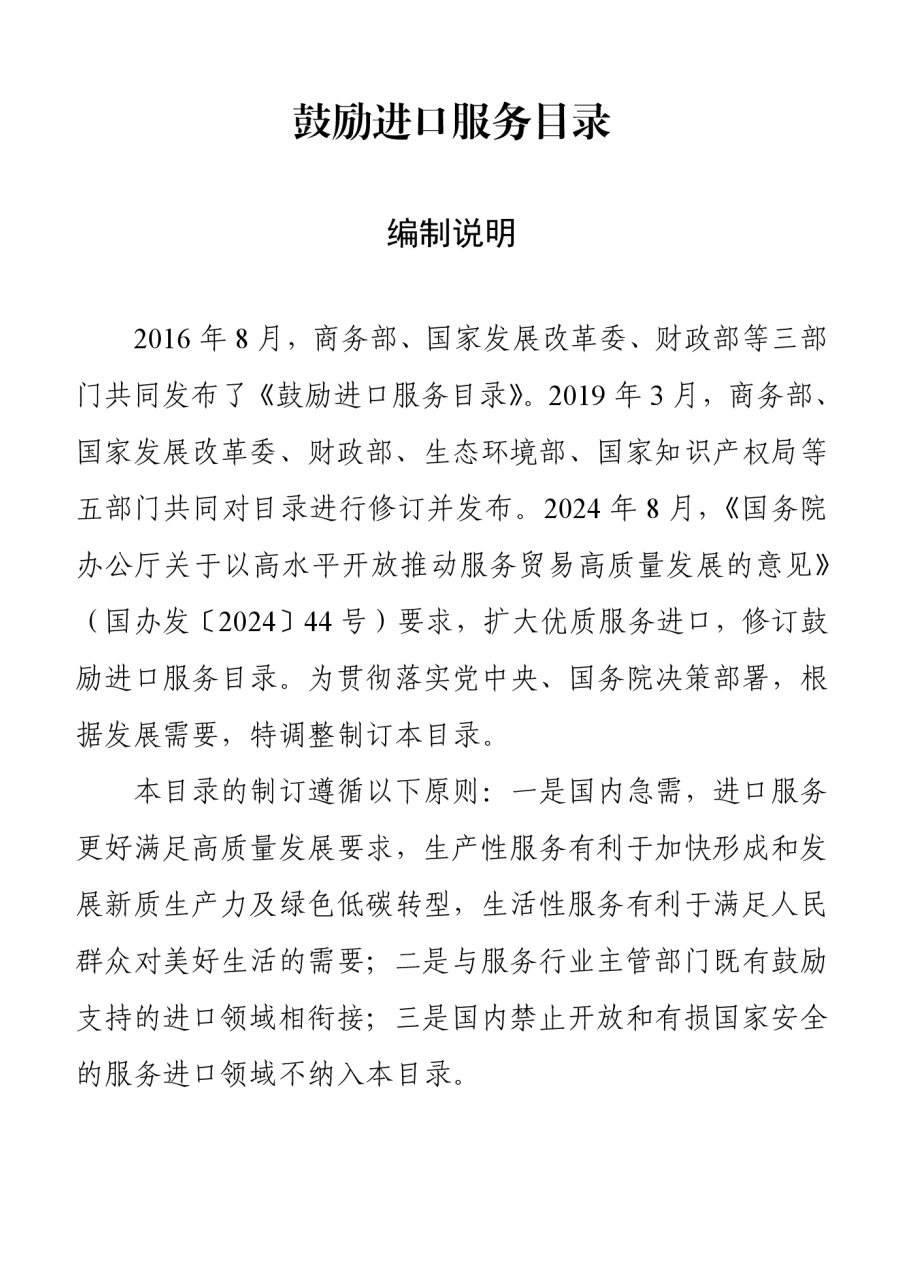 為貫徹落實(shí)黨中央、國(guó)務(wù)院關(guān)于主動(dòng)擴(kuò)大優(yōu)質(zhì)服務(wù)進(jìn)口的有關(guān)決策部署,商務(wù)部、國(guó)家發(fā)展改革委、工業(yè)和信息化部、生態(tài)環(huán)境部、住房城鄉(xiāng)建設(shè)部、國(guó)家衛(wèi)生健康委、國(guó)家知識(shí)產(chǎn)權(quán)局等部門(mén)調(diào)整了《鼓勵(lì)進(jìn)口服務(wù)目錄》,現(xiàn)予以公布。商務(wù)部、國(guó)家發(fā)展改革委、財(cái)政部、生態(tài)環(huán)境部、國(guó)家知識(shí)產(chǎn)權(quán)局2019年第14號(hào)公告同時(shí)廢止。